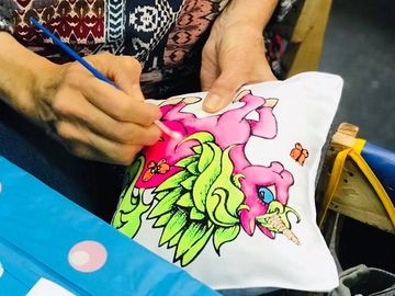our Fabric Range consists of, cushions, pencil cases, sling bags, long cushions, and canvases. You can paint in-store or purchase a kit.